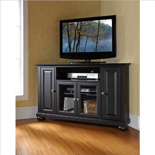 Enhance your living space with Crosley's impeccably-crafted Corner TV stand. This signature cabinet accommodates most 52-inch flat panel TVs and is handsomely proportioned featuring character-rich details sure to impress. The hand rubbed, multi-step black finish with brushed nickel hardware is perfect for blending with the family of furniture that is already part of your home. Raised panel doors strategically conceal stacks of CD/DVDs and various media paraphernalia. Tempered beveled glass doors not only add a touch of class; they protect those valued electronic components, while allowing for complete use of remote controls. The open storage area generously houses media players and the like. Adjustable shelving offers an abundance of versatility to effortlessly organize by design, while cord management tames the unsightly mess of tangled wires. Style, function and quality make this cabinet a wise choice for your home furnishings needs.